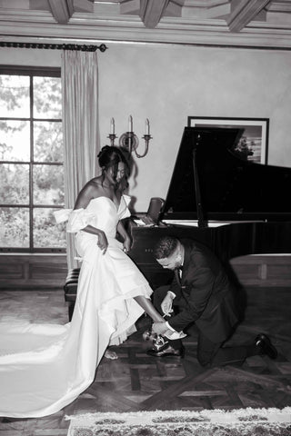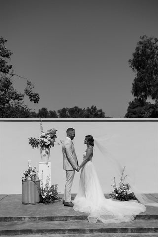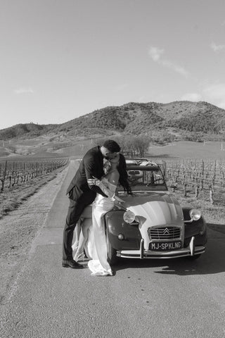 Sleek and sophisticated, this black and white suite pairs minimalist design with bold contrast—perfect for a formal celebration with a modern edge. Picture tailored tuxedos, a string quartet, and a candlelit reception where every detail feels intentional. It's "old money" magic on paper.