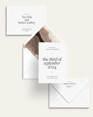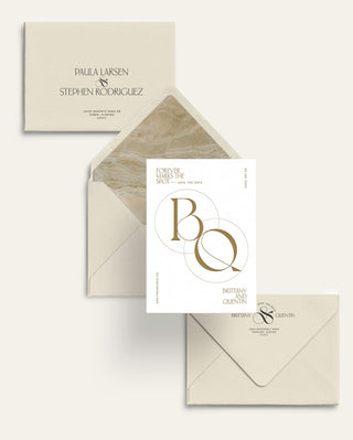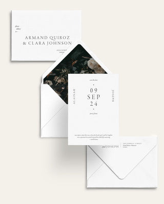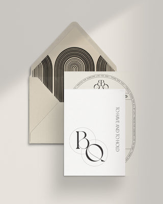 This invitation suite channels the glamour and opulence of the Roaring '20s with bold typography and art deco-inspired details. Perfect for couples who love to make a statement, this brings a touch of drama and playfulness to your big day. Picture your wedding in a swanky, unique venue, champagne flowing, and a vibe that’s bold, unforgettable, and full of energy.