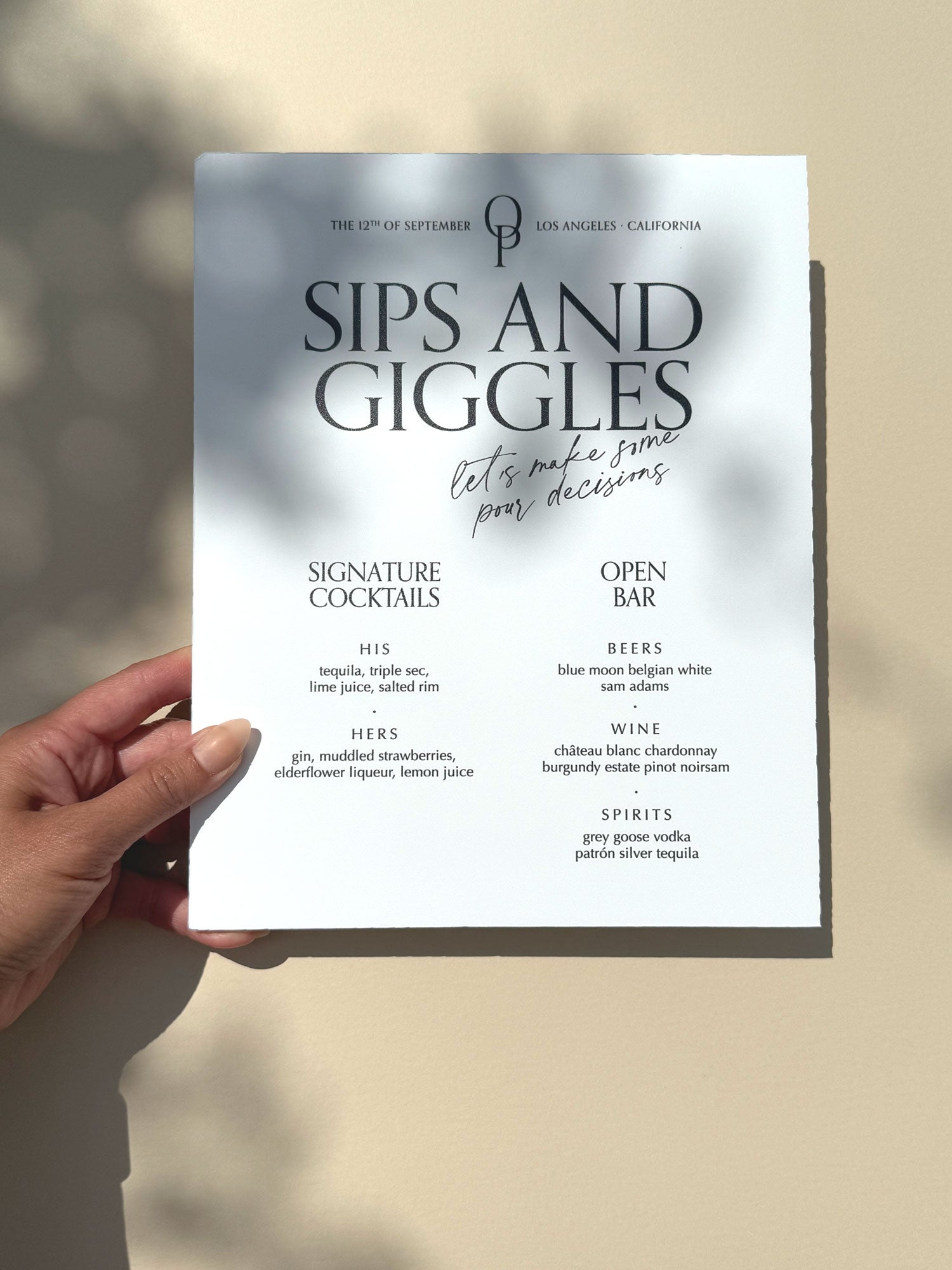 Our Blase wedding bar menu sign is a classy-meets-casual stunner! We've blended classic typography with a laid-back script for an effortlessly chic bar sign. It's got all the room you need to flaunt your signature cocktails and rock your open bar selections. Let's get this party started!