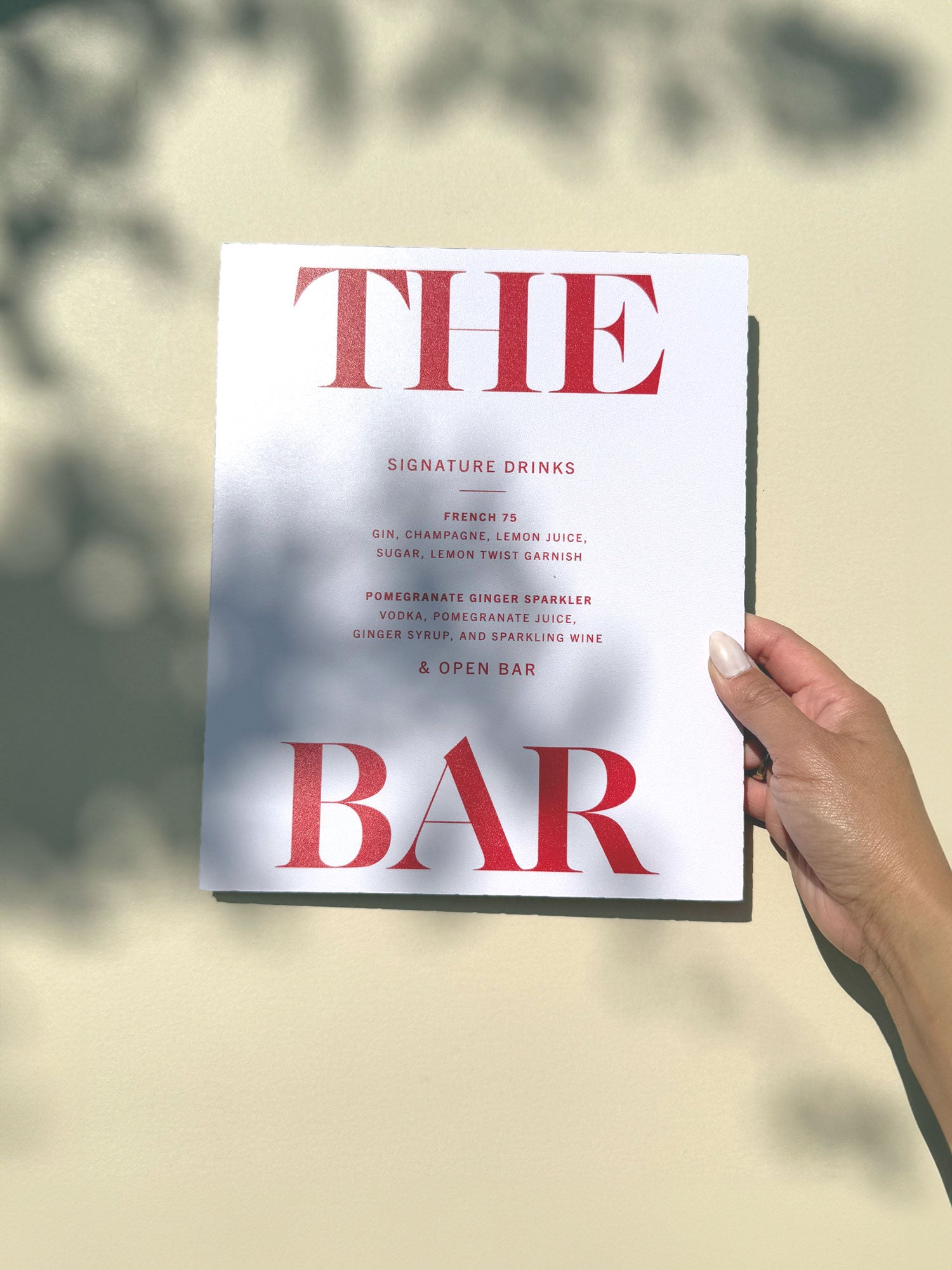 Our Skyline is the modern wedding bar sign of your dreams. Chic and bold, it features a bold and modern font and allows your drink selections to shine front and center. With no fuss and frills, the Skyline bar menu sign is straight to the point and perfect for those with bold taste.